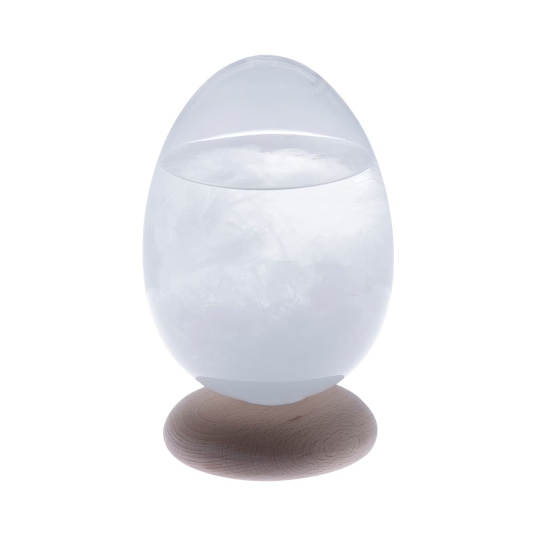生命の鼓動を連想させる卵形のストームグラス。日々の気温や気圧の変化に応じて中の硝子が結晶化現象をして、変化し続ける硝子のオブジェです。台座は硝子部分をしっかりと安定して支えられる構造かつ、意匠にもこだわり局面で構成された有機的な形で硝子部分の存在感を際立たせています。混合液:水/エタノール/天然樟脳/塩化アンモニウム/硝酸カリウム