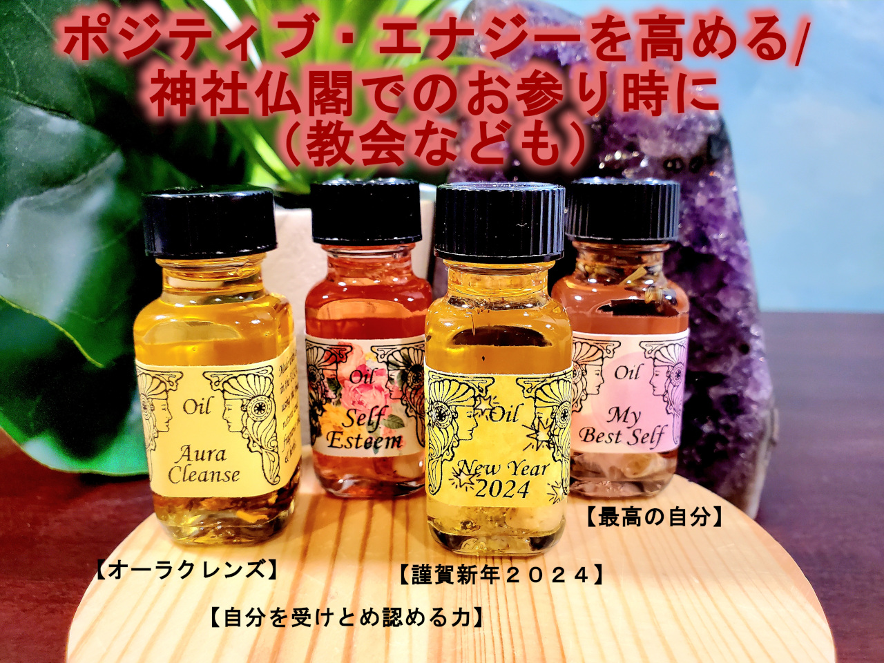 こちらのレシピは、オーラや室内スプレーとして最適です。オイルのエネルギーを保つために、最低1日3回、毎日続けて使用してください。自分の内面のエネルギーを立て直す必要があると感じたら、その度【謹賀新年2024 】で立て直してください。